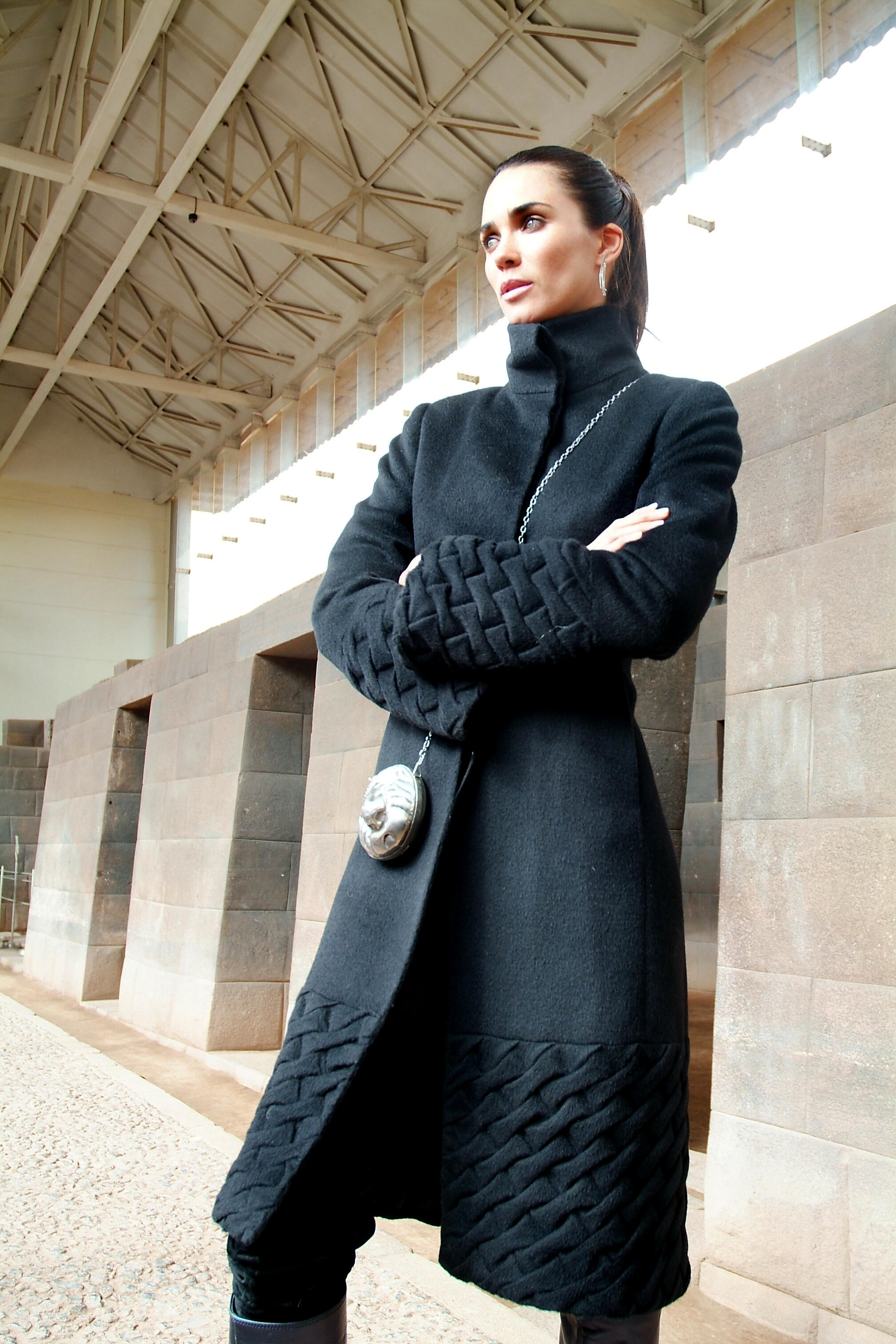 Las prendas se construyen como topografías sensibles: volúmenes que se elevan y se hunden, capas que dialogan entre sí, relieves que evocan formaciones naturales moldeadas por el viento, el agua y la historia. La colección pone en valor el trabajo manual, los fruncidos en baby alapca, los bordados en suri, y los detalles en seda natural.
